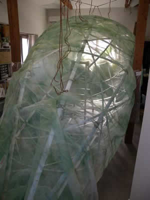 【2013/11/10】 さあ、明日はトラックが来て、材料一式を運んでいく。 アトリエの柱の間にギュウギュウはさまれている首無しサナギは、板橋区立美術館の広い空間に置かれたら、伸びをしながら(あ、サナギはできないか…)ふう?っと息をつくだろうな。 開催まであと2週間。