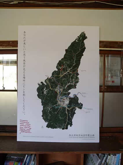 【2014/4/29】 西会津国際芸術村にて 「あなたが美しいと思う風景が見える場所にピンを刺してください。」 元中学校の校舎を活かした西会津町の文化スポットー西会津国際芸術村のなかにこんなボードが立てかけてあった。