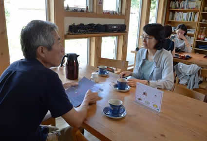 【2014/8/25】 昭和村にて 大芦のファーマーズカフェにて、プロジェクトリーダーズ?会議。 アイデアマンの金親さんと。