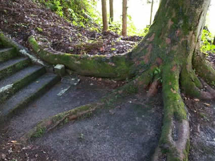大山祇神社のケヤキ?の根が石段前を横切って大蛇のように這い回っていた。 長い時の経過を感じさせる。