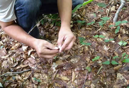 【2014/8/25】 昭和村にて 2 ブナの実をむいてみせる菅家さん。 むっくりした皮の中に2粒。 熊はご丁寧にも、それをさらにむいて食べるのだそうだ。 地面の芽は5年目程度のブナ。 かなりゆっくり育つ。