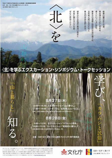 【2015/8/11】<北>と向き合う2日間、「<北>を学び、知る」 神聖な山々が里を取り囲む会津地方。 その山間部ならではの興味深いテーマに、山岳信仰や、豪雪地帯のくらし、自然物から宝を生み出す手仕事などがあります。 今月、それらについて専門家に伺い、みんなで学び、語り合う機会を設けました。飯豊山の眺望を味わい、昭和村を歩くという、心身の浄化が期待できるプログラムです。 詳細は追ってお知らせします。今月27(木)・28(金)ぜひ会津行きをご計画下さい。