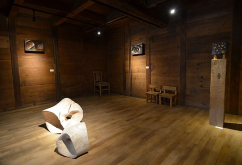 丸山 芳子 Maruyama Yoshiko 「羽化」@村藤店蔵 同 サナギから飛び立つ蝶に東北の人々を重ねて (※右の背景写真⇒)
