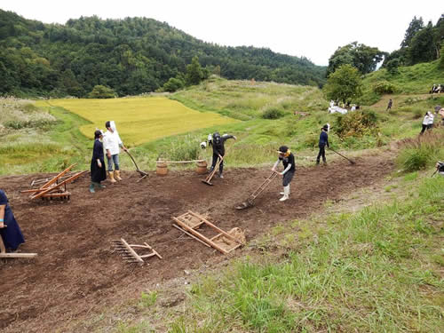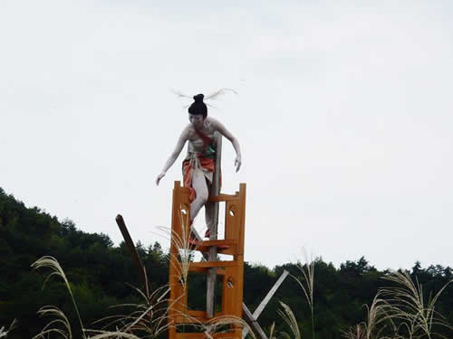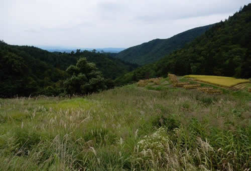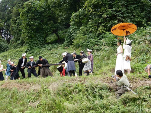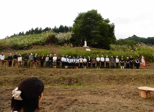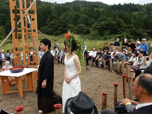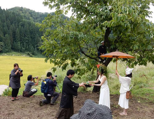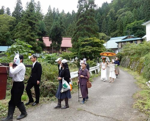 【2016/9/24】森の婚礼 演出過剰に形骸化した人間界の結婚式に疑問を投じるような、けもの界の祝儀に招かれた。 福島県喜多方市の楚々木集落にて行なわれた棚田劇「森の婚礼」(岩間賢さん監督)。(※右の背景画像)⇒ 動物の面をつけた方々に導かれ、山間部の起伏に富んだ地形を回遊しながら、この地域の婚礼文化にも触れた、想像力を刺激するものだった。 なによりも、この大地や空や生き物たちに包まれながら、集落の方々と知人の協力によって、夫婦になることを祝ってもらった新郎新婦のふたりは、なんと幸せ者だろう! ◆眺めのごちそうー 場所: 福島県 喜多方市