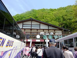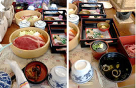 気がつくと 出発の時間! 急がなくては! バスに 乗り込むと 何か・・ 皆 の 目から 白いビームが・・・ え?? 時計を見ると 出発 ぴったしの時間なのに・・・ 気を取り直して バスは お待ちかねの 昼食の会場に〜〜?(↓)