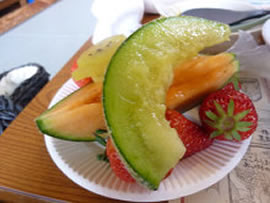 見よ!! この てんこ盛りフルーツ!! これで 二度目の おかわり・・ フルーツは別腹ですから!! ≧(´▽`)≦アハハハ 流石というか・・ すごいというか・・・ 特殊技術というか・・・ (何が言いたい?) うす〜〜〜〜〜〜く 切ったフルーツ メロン・・ しかも美味しく 熟れ切った 柔らかいメロン 切り分けるのは至難の業では? すごい技術だと 思います〜〜〜♪ と〜〜〜 満腹で 食べ過ぎて〜 次の移動先 今日の(GW) メインの藤公園に Go〜♪ by fujiko (2014.7.10UP) 〔To be continued〕⇒
