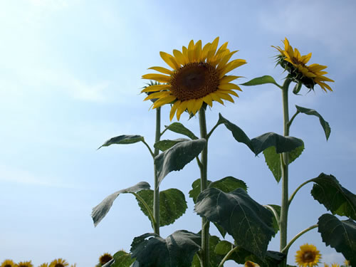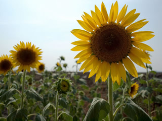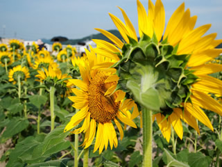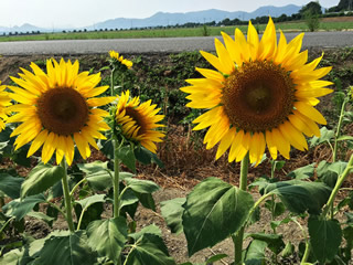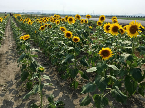日帰りの旅 最後の訪問地 ひまわりが 数万本咲き誇るという・・・・・・・ え? あれ? ひまわりの絨毯の筈が・・・ 絨毯では無く・・ 小さな センターラグ! せめて・・ 少しでも 沢山咲いてる風に 見える様に・・