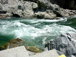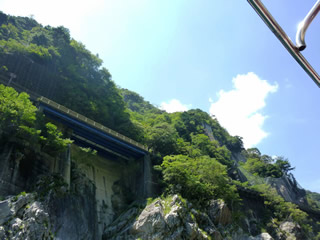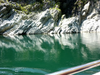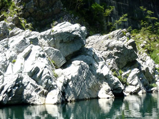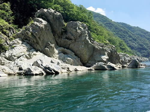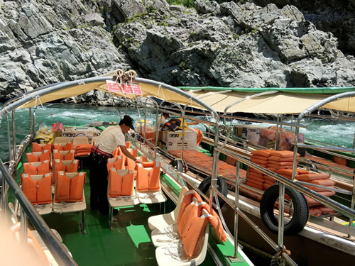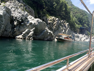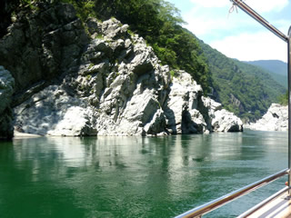 風も心地よくて 波も穏やか! オオボケ・コボケ と読みます! 危険な所を歩く と言う意味があるそうです でも今は国道が整備され 安全で便利になっています こんな流れの 数十倍? もっとかな?? そろそろ 川下りも Uターンして・元の場所に 向かいます 川下りの船旅を終えて レストランに! 入る前に・・・