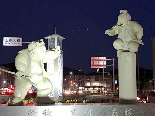 ドラマ仕立てでは 無いけど この辺り・ 動画をしっかり 鳥居さんを抜けて・ ここで もしかしてキツネにだまされた??! そう思い込んだσ(・・*)アタシが 甘かった!! これでは 願い事叶わない? (*ノ-;*)エーン 重いの文字が! 坂道のアップダウンで少しお疲れ?(普段の運動不足!) で 選んだのは〜〜〜〜 アイスだと期待した そこの(*・・)σアナタ 残念でした! 美味しそうな香りと 人柄の良さそうな じっちゃまの お店! さて そろそろ 市内に引き返さないと! 着いた駅は お!! 上がると五条大橋! もしかして・・・ 弁慶も牛若丸も