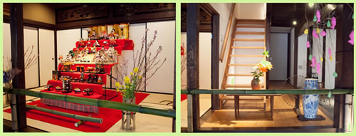 勿論段飾りは 無くてはならない 大好きなおひな様 華やかな桃の花 青竹に 添えられたお花が 新鮮で可愛い