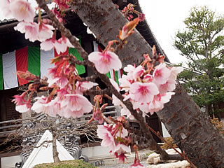 これもその内の一つ とんがり屋根が 特徴の 三角邸 看板の解説を見ると とても栄えた街だったのでしょうね? 美味しそうな においに釣られて 出てみると〜〜 臨時の屋台とか 手作りの和風なお店 あ! そうそう 昨年の今日は 殆ど 蕾だったけれど ここ西光寺さんの 河津桜は そそ! 日本酒のメーカーの試飲と 甘酒のお接待も! と・・ 言うことで イイダコの天ぷら げっと〜〜〜〜 ♫ 普段 買うことは殆ど無いけど〜〜 今年の新企画らしい 籠に乗っておひな様巡り・♫♫