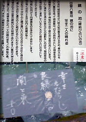 ここまで来たのて 何としても 雪を見たい!! 探しました~~♪ 何しろ 温暖なところなので 反対に 豪雪のところは意外と暖かいかも? 半分の雪だけでも 嬉しいのです! ≧(´▽`)≦アハハハ とにかく 普段より 下着を一枚増やし だから・・こだわりの 雪景色~ ゆき~~ この彫塑には・・ ちょっと 気の毒だけど~ 借景の滝も 凍ってませんでした! 凍ってなくても 綺麗でしたけどね~~?! 作品も 沢山展示してあって お庭も 作品もしっかりと 鑑賞したら 次の 場所 ~!! 占い用の 和紙は水に浮かべると文字が浮かび出てきて え? σ(^_^)アタシ のは・・? 近くだったけど・・ いいのか 悪いのか~~???