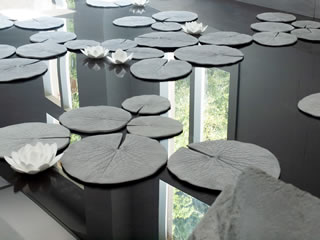 水に浮かぶ蓮の葉 鏡の水面は窓からの光を写して・・