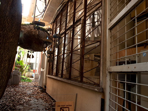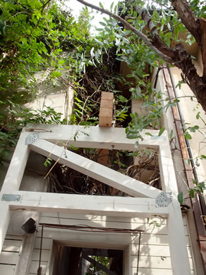 建物同士の隙間 空間 その入り口の上には 自然に蔓延った緑の植物 魔夏 の暑い時・・ようやく探し当てた所 瀬戸芸はこんなだから !!