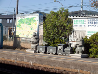 たどり着いたのはここ! 道ばたの茶堂 天井には しっかりと太い梁が! ここはお遍路さんの はい この川でおばぁさんが 洗濯に来て桃太郎を・・ ええ・ 桃太郎さん出てくると思ったそこの貴方 (又 なが〜〜〜ぃ お話にするつもり??) お詫びに 駅のホームにいた桃太郎さんをどうぞ! by fujiko (2019.12.7UP) 〔To be continued〕⇒
