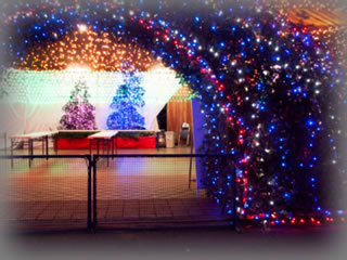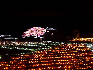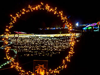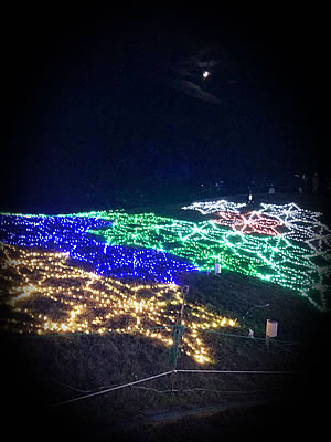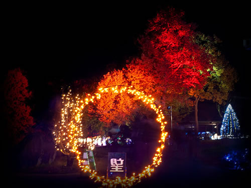 燃える様な紅いツリーを背景に 輪の中に 文字が! こちらは清らかな光の海 二つで・・そう 希望 お月様と(小さすぎだけど 立派なお月様です!) そう〜 公園のセンターから見ると
