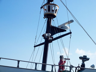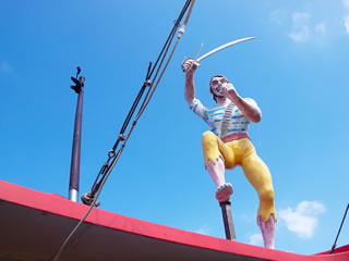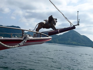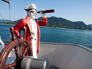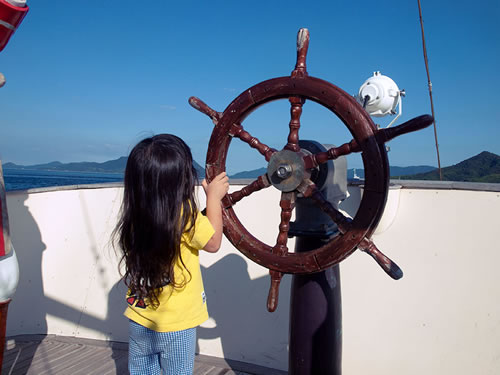 可愛い ちびっこ船長!! (後ろ姿貸してね〜?!) ゲゲ?!! 海賊も出現! (*'ー'*)ふふっ♪ 大丈夫 翼のあるライオンのフィギュアヘッドが守ってくれる! 海は穏やかな瀬戸内海 しまなみ海道〜〜♫ 島にようやくたどり着くと 出迎えてくれたのは