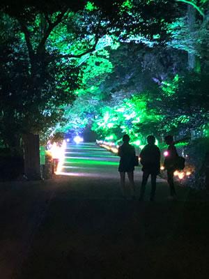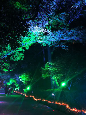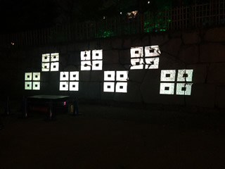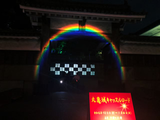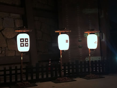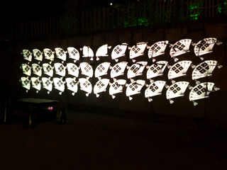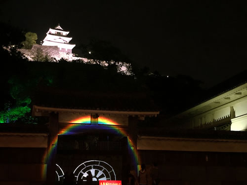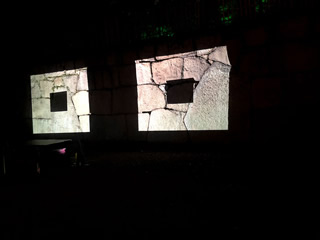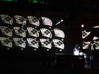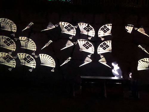 城壁に映し出された 沢山の扇 あ! 開き出した〜 少しずつ〜〜 全ての扇が開いた所は圧巻です! 扇だけではありません! 四角い眼?? いえ そう〜 素敵なプロジェクションマッピング! 幻想的に 立体的に 普段にはない風景が! でもね? この時・・ 普段なら上がって・・な場面 ≧(´▽`)≦アハハハ)