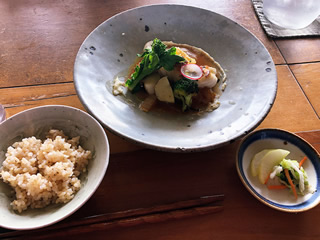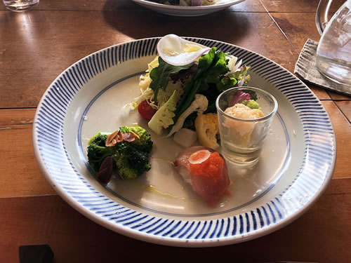 最初に出てきた ロマネスク入りのサラダ かなり減らして貰った(ここから更に減らして貰った) お肉とお魚のコースがあって〜私が注文したのは 広く開いた縁側から見える田園風景 ええ・・私たちも負けてませんでしたけどね?? o(*^▽^*)oあはっ♪ そして締めのデザート は甘くて香ばしいプリン!