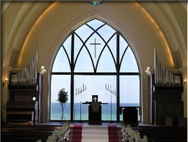 結婚式は、沖縄の真夏の太陽が燦々と降りそそぐ中、超高級リゾートホテル「ホテル日航アリビア」内の教会で行われました。