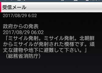 「ミサイル発射。ミサイル発射。北朝鮮からミサイルが発射された模様です。頑丈な建物や地下に避難してください。」(総務省消防庁)