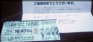 それにしても、“2名様宿泊券”と書いてあるのに…わざわざ朝の忙しい時間に電話してこなくてもと思うのですが。 この宿泊券、よく見ると“60歳以上限定”とあります。 本当は代筆禁止なので、少しだけ胸が痛みます。 皆さん、喜んでいるおばあちゃんに免じて秘密にしてくださいね。 毎年の傾向として、6月と8月は、懸賞が当たりにくいようです。