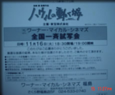 内容も「千と千尋の神隠し」の顔なしを引用したかのようで、「猫の恩返し」並。 原作が児童書だし・・・画像は綺麗でしたが、特に印象に残るシーンもなく、期待外れかもしれません。 これじゃ「千と千尋のハクの声優でも良かったじゃん!」って感じでした。 隣国の王子も、魔法が解けてから存在感ないし、別に隣国の王子じゃなきゃいけない理由もないし・・ 要点を絞らなかったので、意味不明気味。 だけど、「第九夜」の冒頭でもご紹介したように、ワーナーマイカルの劇場で、11/7応募した試写会(締切日応募!)も当選しているので、ハウル2回目の試写会にいってきます。 そしたら・・・何と実家も「ハウルの動く城」2回目の当選だそう。 DVDーRも当選していたので、一家で5つ当選でした。