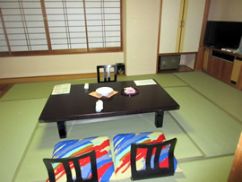 私達は通りなれているけど、いきなりそこから車線の数が減ってオレンジラインの内側走るなんて信じられないです〜。危ない、危ない! 何とか無事到着して、番頭さんに「前の駐車場はいっぱいなので、娘さんと奥さんだけ降ろして、運転手さんだけあの先の駐車場に車止めてきてください」と言われたので、娘と私は降りて、さっさと宿泊手続き(笑) 夫は何も知らず、日帰りの休憩部屋だと思って、入室ヽ(^。^)ノ 見事サプライズ成功です!