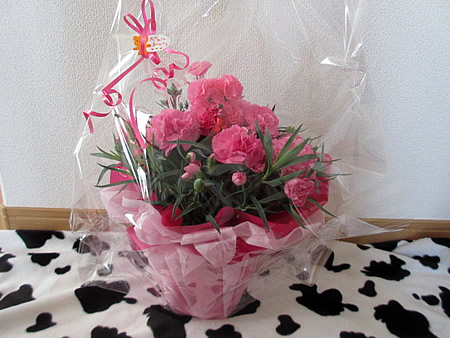 〜と、心配しているんだか鼻で笑っているんだかの夫。 母の日当日、向かいの家に花屋さんが止まって「親孝行だよね〜」と言ってたら、 犬が可愛らしいピンクのカーネーションでした。 母に手渡したら、玄関に飾っていました。
