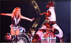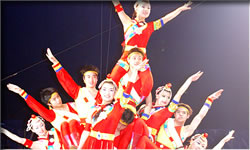 チャーリーズエンジェルのような中国雑技団のお姉さんが自転車に乗って腰を曲げた上を自転車に乗った別のお姉さんがでんぐりがえし。