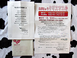 ブロ友さんはおそらくネット応募で当たったと思うと言ってたんですが、私はハガキだったので、どっちで出しても、当選確率は変わらないと思います。 12/24日指定ってシールあるのに、佐川のおじさんが、気をきかせて早めに届けてくれたので、プレゼントを買わずにすみました。 おじさんの勘違いナイスです(*^_^*)♪ 阿武隈急行「クリスマス号」は生放送の地元のテレビ局の番組から3組にプレゼントでした。 電車の中で、クリスマスのイベント実施の貸切で、1組2500円でした。