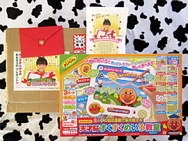 アンパンマンの知育おもちゃは、5400円の品です。 日本玩具協会から全国132人のお友達に3000円から5000円の好きなおもちゃを選んでプレゼントでした。 大々的に全国誌にも載っていたので、無理だな~と毎年思いつつ、応募していました。 ネットからもハガキからも出せたんですが、市内のブロ友さんも当たっています。