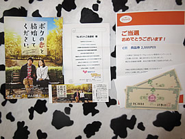今は、全部の懸賞に手を出すわけではなく、当たったら使うものだけにしています。 時には、夫や父へプレゼントすることもありますが、絶対使わないものは、労力の無駄なので、出してないです。 たらみの撮影後、もう1通当たってたので、UPです。この映画は、試写会がはずれて、別の懸賞で見つけて応募して当たりました~。 映画鑑賞券は、地元テレビ局のサタふくで当たりました。 どっちが当たりやすいかはわからないけど、今年に入り、FAX応募で当たらず、当たっているのはメール送信分です。