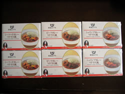 第44夜で当選していた5千円カタログから帝国ホテルのカレー3種6個セットを頼みました。 この先も帝国ホテルには泊まれそうもないですが、せめて、ご馳走だけは高級なものを食べてみたい・・・。 そんな夢、かあさんが叶えます(笑)