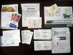 最初から、コーヒー1本やパーティー招待状、食育イベント等のチケットや商品券、映画招待券の当選がごっそり届きました。 まさに収穫の秋で、種(ハガキ)は実ったようです。 商品券は本当に生活費に直結しているので、助かります。商品券が月初めに届くと、幸先いいですね。