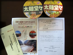 宿泊券にしては大きい箱だったので、急遽作ったW賞かな?と思いあけてみると、新製品のカップ麺(太麺堂々)2個と封筒が。 開けてみると・・・日清食品から、全国で、100人の40箇所から選べる温泉宿泊券が、当たりました。 今年の狙いは、温泉宿泊券でしたが、さっそく叶いましたね(*^_^*)V これも、枚数ではなく、ただの運です。