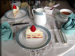 お金を出せば、福島県郡山市で、私と同じ体験が出来ます(笑) ただ、本当に1日1室限定なので、記念日のご予約はお早めに~。 3時になると、受付時、3種類からチョイスしたケーキが運ばれてきます。 私も妹もショートケーキ派なので、ショートケーキをチョイス。ほかにも、「チョコケーキ」と「モンブラン」から選べました。