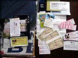 スーパー&おーいお茶でB賞で、お茶10本、雑誌で生茶1箱24本。いっきに34本もお茶が!! これは、高級食材だと思いますが、アヲハタで当たった「ホテルオークラマンゴーケーキ」、ポケモン映画ペアチケット。近場のスーパーで5組枠で、2通応募して当てました。 あと、全国のオープン懸賞で、明治屋99周年ジャム、さらに珍しく職場にしか下がっていなかった東北限定フリスクB賞でフリスク詰め合わせ、ESSEオリジナル5WAYバック(6色から選べて、全国で1000人でした)。 雑誌に応募券がついているものって1通しか応募できませんが、何冊も買う人って滅多に居ないから、当たりやすいと思います。小さいけど、佐藤のお茶のサンプルもきています。 1年かけてモニターしていたので、12回に渡って、月2000円か3000円が毎月届いていました。合計で、3万円あります。回数はカウントしませんが、金額だけ足しておきますね。 それにしても、よく私、使わなかったと思いません??? この商品券は、イトーヨーカドーで、家族の服など残るものを買います。
