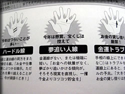 2011年の占いで、私が一番気になるのが手相! 雑誌を見たら、いきなり私に「夢追い人の線」が!!! 確かにいっつも「当たったら~♪」と夢を見ている私だから、その意味では、占いも当たってるとワクワクして読むと・・・ 『金運線が無いもしくはお金へ執着していなくて夢ばかり追いかける傾向が。そろそろ現実を直視し、一攫千金よりコツコツ貯金を』と!! 2011年、はじまっても居ないのに、全然ワクワクしないじゃないですか~! ちなみに左手薬指の下に縦線です。