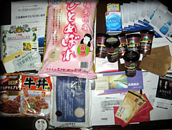 あと、コメ5キロ&2キロと牛丼3食とハヤシ3食に、商品券がいっぱい来ています。これだけあれば、おかずもご飯も十分ですね(*^_^*) コーヒーも飲みきれなかったので、友達に配りました。映画チケットも3枚あるし~、洗剤も配りました。 当選人数少なくても、出し続けたのが良かったようです♪ 新宿高野フルーツ高級果物は、1箱送料込みで5250円だそうです。アヲハタジャムで当選しました。 ちなみに、2通応募で1つ当たりました。枚数少なくても、当たる時は、当たります~。当たらない時は10枚出しても当たらないので、運だと思います~! 私のいつも見ている番組からも、キャンペーンWEEKで現金5000円が当たり、今年の2月に私、新型インフルエンザでひどい思いをしたので、娘の予防注射代2回分に使いました。 でもキャンペーンWEEKで宿泊券や現金などが当たったのって、3年ぶりです。地元テレビ局なのに、こないだは、7人枠に2000通とか来てましたから~。