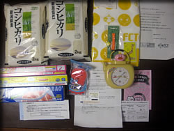 ブタメン~ブヒブヒ♪と目覚まし時計が鳴きます(笑)普通のpipipiもありますが、インパクト大です。 あとコメが4キロも当たっています。それとコメントが読まれタオルとクオカードを。 旭化成から残念賞の詰め合わせが。去年、本賞の商品券も当たっているので、Wで当選です。