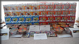 ピンポーンって鳴り!今度こそカップめん!と思って出たら、福山運輸さんで、「お茶漬け6食セットが6袋」(笑)次にクロネコの宅配便がピンポーンて来て、「商品券を2000円」(笑)やけにお届けが多い日でした。 あとで、ちゃんと、カップめんも届き…さらに、実家にもラーメンだけ来たよ~!というわけで、ラーメンが、236食当選しました~! お店屋さんでも開けそうなくらいですよね~。せっかくなので、リビングに並べて集合写真撮ってみました♪