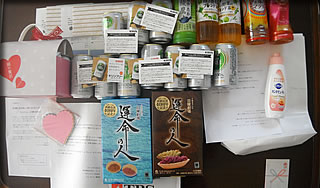 「ちんすこう」のほうを「おじさんの1周忌の仏壇に供えて!」って母に渡しました。 そしたら、 この別なルートで、私の口に戻ってくるって・・・・・・しかも、1週間以内の出来事です。まさに、「運命の人!!!!!」 飲み物は、ほとんど、ネットの先着プレゼントです。月末には、冷凍食品のバーコードで、もれなくシリコンのふたとか届いています~♪ 色は選べなかったけど、偶然別な色が届いて家族で私のふた!と分けあいました。あと、カモ井の非売品の色鉛筆のマスキングテープが先着でいただけました。 懸賞のほかにも、爪楊枝にマスキングテープを貼って旗を作ったり、パンの袋を止めたり貼って剥がせるテープなので、便利に使っています。