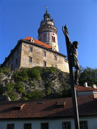 ヴルタヴァ川〔モルダウ川〕にかかる小さな橋から、キリスト像と城の塔を見上げた。