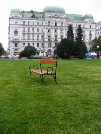 教会前に広場があり、結構な広さの芝生の「真ん中」にベンチが置いてあった。