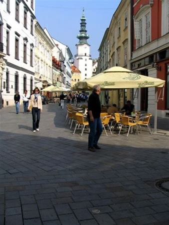 この写真はスロヴァキアのブラチスラヴァの中心部。向こうに見える塔はミハエル門。