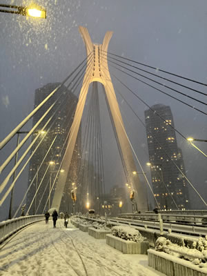雪の中を歩くなんて20年ぶりくらいかな?と思いながら一つ先のバス停まで橋を渡って行きました。