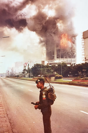 この前にも、9月13日にジャカルタ北のタンジュン・プリオク港で丸腰のイスラム教徒の抗議団に警察が発砲して数百人が死傷するという事件があり、また1982年頃から始まっていたミステリアス・シューティング(軍・警察の秘密部隊がリストアップされたチンピラを夜間に銃殺して遺体を放棄して見せしめとする事件。 スハルト体制内の対抗勢力つぶしとも言われている)と呼ばれていた事件も継続して発生していて日本人社会でも不安が広がっていました。 11月12日は6回目の結婚記念日でラトプラザにある和風焼肉店「JUJU」へ行ったのですが、その翌日11月13日にはサリナ・デパートに火災が発生(これも放火と言われている)。