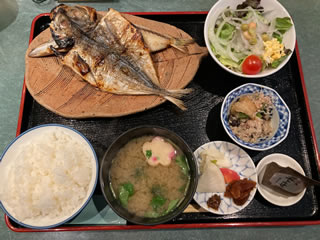 干物で有名な「釜つる」で干物(鯵とカマス)定食。