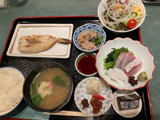 太太は干物(フグ)とお造りの海幸膳を注文。